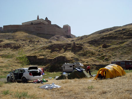 Au retour, arrêt « tranquille » à Göle : village sympa et calme où on nous sert le thé en même temps que l'essence. Une nuit à Kars où on nous propose un camping dans la cour de l’école… On préfère l’hôtel Karavensérail… Route vers Dogubayazit via Igdir, écrasé de soleil. Pique-nique au bord de la route au pied du Mont Ararat.