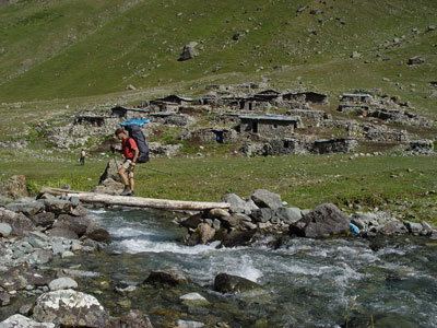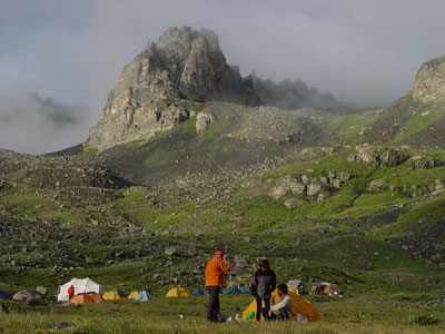 Le reste du séjour nous verra faire un peu de rando et du tourisme. Route vers Yusuféli via Erzurum et Tortum. Puis, piste jusque Olgunlar : ça racle sous le bas de caisse ! Passage à Karkol (ancien nom de Altiparmak) et Barhal. On laisse la voiture à Olgunlar et direction le village de tente au pied du Kaçkardagi, destination très fréquentée par les randonneurs. C'est un vrai village de tentes qui est établi à son pied.