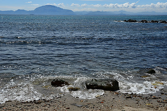 "The Andalucian coast to coast walk" (page 11) Samedi 20 avril (jour 19) Très froid hier soir et ce matin aussi. On profite d'une table en pierre pour se faire un deuxième café, histoire de se réchauffer le bout des doigts. Descente sur El Pelayo. On rate le petit sentier qui quitte la piste pour rejoindre le village. Faut remonter ! C'est pourtant un beau sentier, confidentiel certes, qui serpente au milieu des fougères. Arrêt bocadillo et pour le plein d'eau à l'hôtel Las Piedras, deux clémentines et un paquet de pâtes à l'épicerie bazar. Une piste et un sentier nous descendent jusqu'au bord de la mer ! Cala Parra, superbe petite crique déserte où on touche la mer pour la première fois. C'est encore la Méditerranée, l'Atlantique c'est pour demain, après Tarifa. Les côtes marocaines semblent à portée de main et le Jebel Musa trône en face de nous.