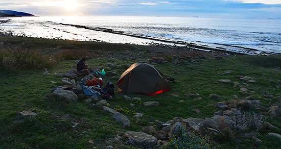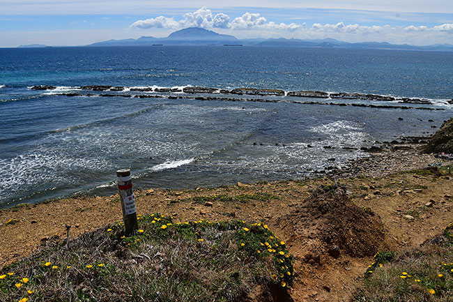 La journée se continue par un beau sentier côtier et le soleil nous accompagnera toute la journée. Les strates de calcaire, relevées à la verticale, viennent se perdre dans la mer et dessinent un curieux relief. Dernier bivouac ! On pose la tente, un peu à l'abri du vent, et le ciel noircit au-dessus de nos têtes. La côte marocaine est encore au soleil et le Jebel Musa regarde passer les lourds tankers.