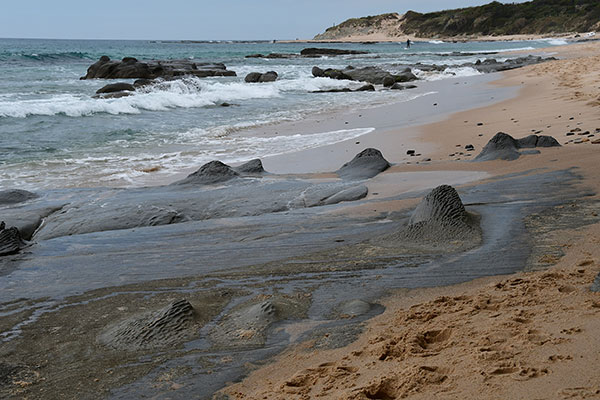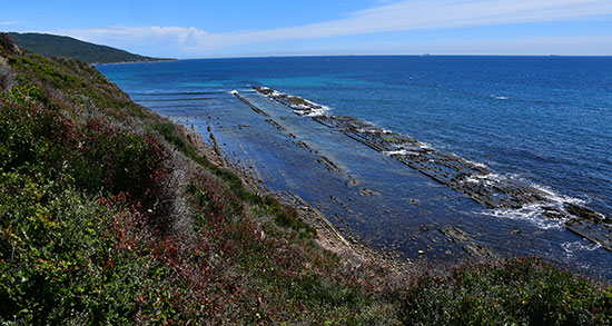 La côte s'incurve et on continue de la suivre, de criques en criques, de plages en plages. La marée est haute maintenant ce qui nous oblige quelquefois à prendre un sentier un peu en hauteur. Mais on n'échappera pas à un bain de pied à cause d'une vague traîtresse.