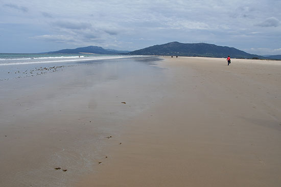 On s'attaque à la longue plage de Tarifa où il vaut mieux attendre la marée basse pour marcher sur le sable dur. Il faudra tout de même se déchausser pour franchir un petit Rio qui vient se jeter dans la mer.