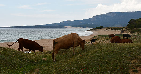 Le ciel se couvre et quelques gouttes tombent, juste pour nous faire peur, rien de méchant. Un troupeau de vaches nous accueille sur la plage de Bolonia. On se pose un instant pour apprécier le moment. Nous voilà au terme de notre parcours et on termine l'anisette pour immortaliser cet instant.