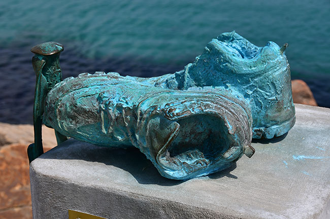 Belle lune, cette nuit ! Et, ce matin, la tente n'est même pas mouillée. Une bonne heure de marche sur le sentier côtier pour atteindre Tarifa qu'on traversera un peu vite. La ville est déserte et bien jolie. On y reviendra dans quelques jours pour y passer trois jours avant de prendre un bus pour Malaga. On aura le temps de l'apprécier et de découvrir toutes les ruelles de la vieille ville, visiter les églises et le château de Sancho "le brave", goûter aux tapas et aux pâtisseries. Je trouverai la discrète sculpture dédiée aux randonneurs et aux trois sentiers européens qui débutent à Tarifa, le point le plus au sud du continent européen (E4, E9 et E12).