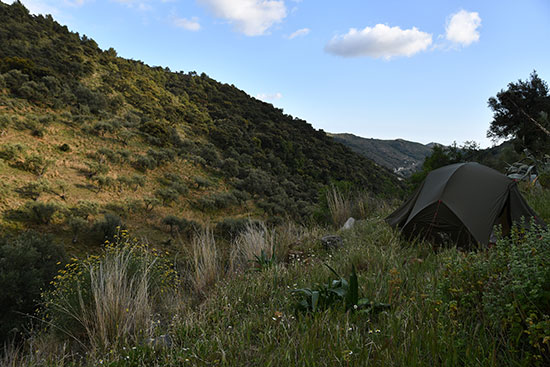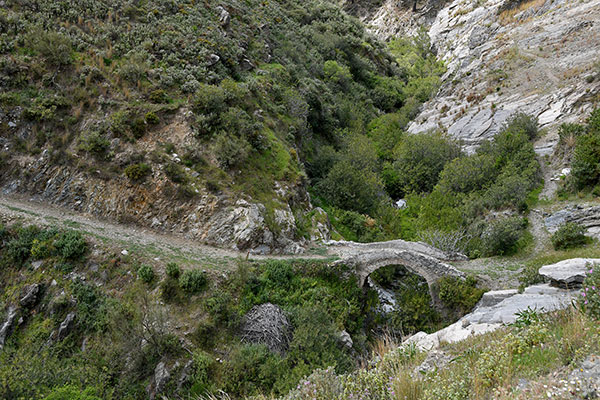 La remontée du Rio Cajula est vraiment fantastique avec un festival d'orchidées. Des orangers et des citronniers poussent sur de vieilles terrasses, les fruits à portée de main... On ne s'en privera pas ! La montée au Puerto de la Cruz del Muerto n'est pas facile à dénicher. On suivra la trace au GPS. On pose le camp près du pont romain, un peu avant Sedella. On profite de ses petites ruelles et on reconnait le départ du chemin pour demain matin.