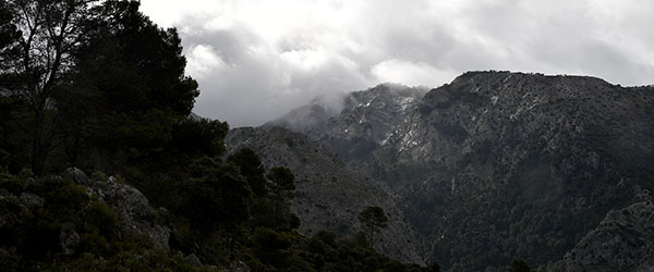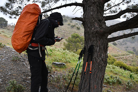 La montée régulière suit une large piste. C'est le déluge ! Forte pluie et vent glacial. On quitte la piste un peu avant la Fuente del Pisadico del Nino Dios qui doit être un beau coin sous le soleil. La progression devient difficile du fait du vent, de la pluie et du sentier très discret (encore une fois merci au GPS). Difficile de s'attaquer au Collado de la Gitana dans ses conditions. Rebrousser chemin ? Prendre un échappatoire par un ravin et rejoindre une route ? On tente la descente du barranco. Mais cela va se révéler plus difficile que prévu. Les barres rocheuses deviennent hasardeuses à franchir. On remonte donc sur le sentier et retour à Sedella. La montagne dégueule de tous côtés et la Sierra de la Maroma est blanche de neige.