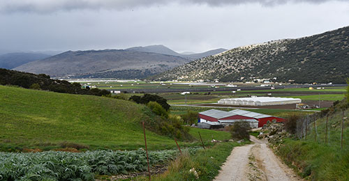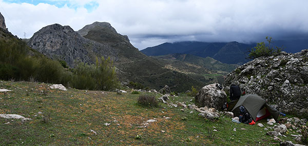 Une belle averse de grêle nous choppe juste à l'entrée du village. On traverse des zones maraichères et industrielles sous un vent polaire. Les rues sont désertes. On se serait bien vu passer une nouvelle nuit à l'hôtel. Mais le seul du village est fermé. Malgré l'aide d'une jeune pompiste qui nous propose un truc à 15 kilomètres de là, on décide de continuer notre chemin. A la première éclaircie et au premier endroit à peu près plat, on pose la tente sur un petit replat herbeux juste au-dessus de l'ancienne voie de chemin de fer qui permettait aux maraichers du poljé d'envoyer leurs productions à Malaga.
