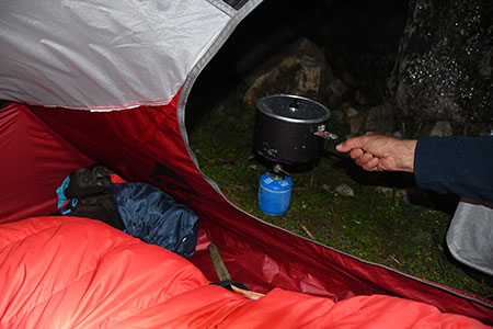 Et la pluie n'en finit pas de tomber. Un vieux crouton de pain, une soupe chauffée vaille que vaille sous la tente et on baisse les rideaux sur cette journée qui ne me laissera pas un souvenir impérissable.