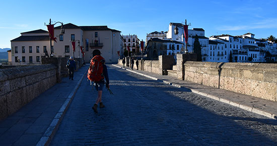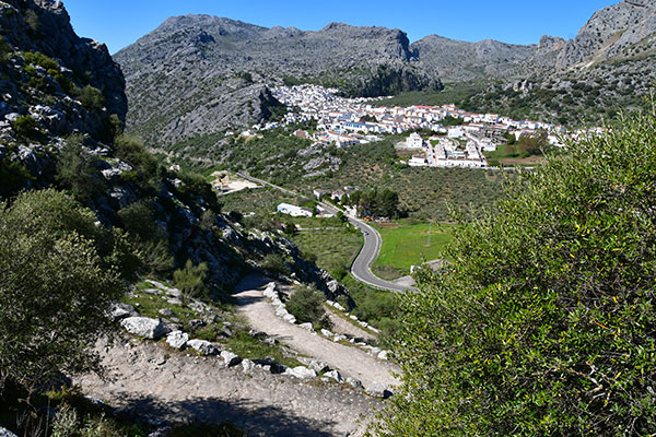 On quitte la piste pour un beau sentier confidentiel qui monte vers un col sans nom. Descente confortable sur une ancienne voie dallée qui, de lacets en lacets, nous mène à Cortes de la Frontera. Arrêt habituel à l'épicerie, au bar pour les bocadillos et le plein d'eau. Pause casse croûte à la curieuse Casa de la Piedra.