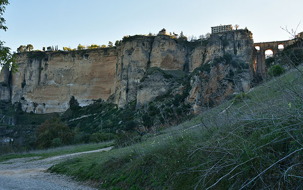 Le chemin qui devait nous faire descendre de la ville est fermé pour cause travaux. On prend donc le chemin des moulins qui nous mène au pied de l'imposante falaise où est construit Ronda.