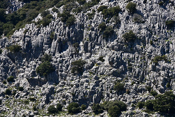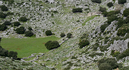 Le karst nous choppe dès la sortie du village lorsqu'on pénètre dans un dédale de sierras (Montalete, Juan Diego, del Palo). Paysage hérissé de pointes ruiniformes et de blocs empilés les uns sur les autres. Quelquefois, des dolines et des poljés, taches vertes sur le gris du calcaire, offrent une herbe tendre et appétissantes aux vaches, moutons, chèvres et chevaux.