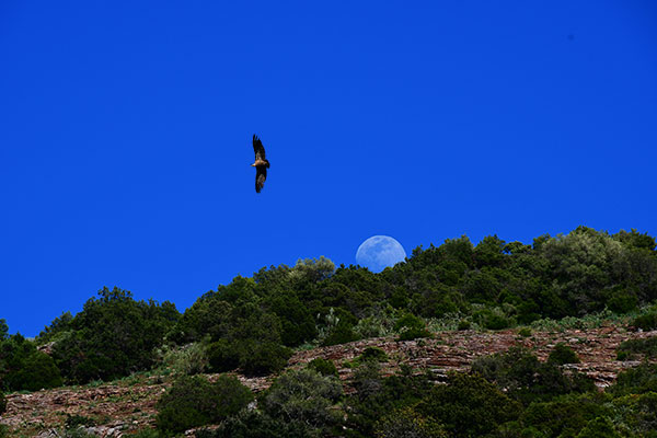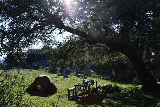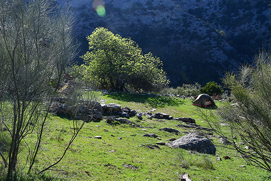 Et c'est reparti pour un long trajet sur une piste jusqu'à la Casa del Conde où on pose le camp. Ferme abandonnée avec une belle aire de battage. Travail routinier de fin de journée, thé, montage de la tente, et une fois le sac vidé, il est rangé dans son sac poubelle pour le mettre à l'abri de la rosée ou de la pluie nocturne. Adossé au mur de la ferme, j'écris et bouquine à l'ombre d'un figuier à l'écorce bien tourmentée. Un aigle tourne dans le ciel et la lune se lève.