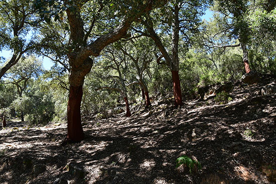 Dans la descente sur El Colmenar, j'ai la sensation d'un changement de végétation, comme si on avait passé une frontière en haut du col. Mais peut-être ai-je rêvé... Epicerie, bar, faire le plein d'eau et une variante aujourd'hui : on voit les premières images de l'incendie de Notre Dame de Paris. Tous les clients sont scotchés devant la télé et nous aussi. Encore un village qu'on quitte par des rues bien pentues. Il ne fait pas bon être vieux et habiter un village andalou... On traverse l'arboretum où poussent plus de 30 espèces d'eucalyptus. Une piste nous mène ensuite vers une forêt de chênes lièges tous minutieusement écorcés. Ils ont l'air un peu bête ces arbres à moitié nus et ça confère à la forêt une drôle d'ambiance.