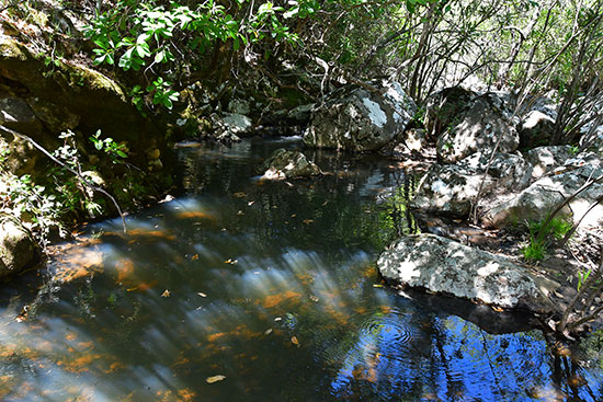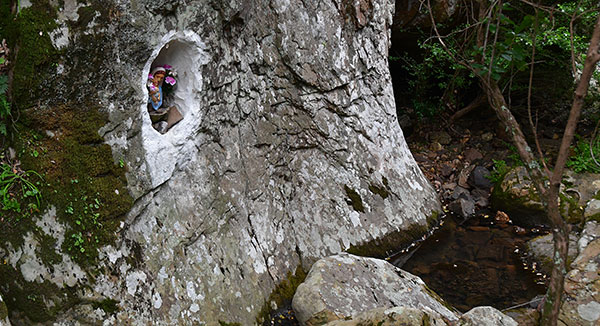 Gros vent toute la nuit. Et ce matin, ça souffle encore bien et il ne fait vraiment pas chaud. De gros nuages noirs barrent l'horizon à l'ouest. Encore un matin où on ne traînera pas autour du café. Un petit sentier descend un vallon au milieu des chênes lièges qui nous abritent du vent. Juste au bord du ruisseau, une étrange niche où une vierge à l'enfant observe le passant. J'ai toujours eu une attirance pour ces témoins d'une croyance populaire attachée à une vie en montagne dont il ne reste plus que des ruines. Les paysans d'autrefois ont disparu, ceux qui ont ouvert ces sentiers muletiers aussi. Il ne reste plus grand chose de ces façonneurs du paysage et la nature en efface les traces. Seules subsistent souvent ces vestiges de leur croyance. Plus personne ne se soucie des ruines, des murets, des chemins mais on continue jalousement à entretenir ces discrets jalons de leur mémoire.