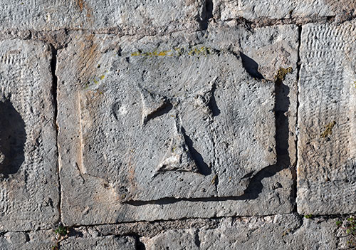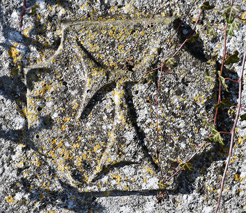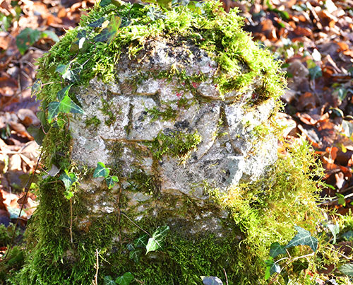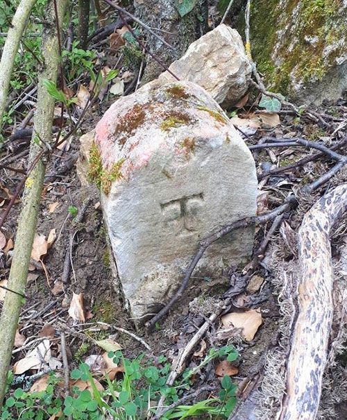 Deux bornes, en bord du chemin (à gauche en montant), espacées de 2 mètres, portent le TAU ainsi que d'autres signes. Coordonnées : N 48.91214° E 006.01549°.