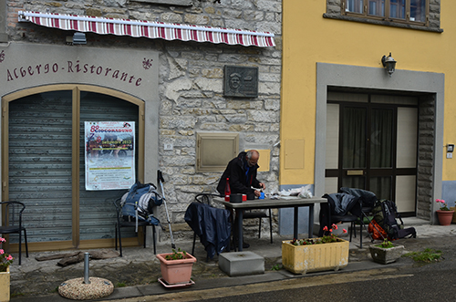 On arrive au village de Montepiano vers 16h et on se pose à l'hôtel Margherita pour la première douche depuis le début. Elle est très bonne ! Promenade dans le village où toutes les maisons sont à vendre. Peu de ravitaillement possible. Achat de quelques olives pour un apéro à la terrasse d'un bar en face du monument aux morts. Repas au resto de l'hôtel puisqu'il n'y a pas d'autres possibilités. Mais c'est bon. On passe la soirée autour des cartes pour planifier les jours à venir.