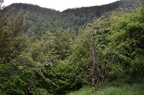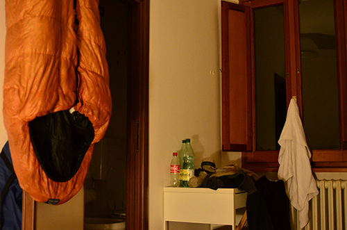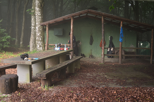 On pose le camp devant une cabane de chasse au Passo Osteria Bruciata. Elle est fermée mais son auvent nous abritera surtout qu'une pluie fine se met à tomber. Une source pas très loin nous fournira une bonne eau. Mon genou me fait toujours très mal...