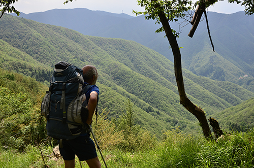 Mercredi 12 juin Du camp 9 hôtel à Montepiano au camp 10 au refuge Pacini Asc : 1055m Desc : 750m Durée 7h43 météo : Petit déjeuner pantagruélique (enfin, par rapport aux derniers jours) à l'hôtel et on quitte Montepiano vers 9h. On débute par une bonne grimpette qu'on avale au rythme montagne. On atteint ainsi les crêtes et c'est à nouveau la routine poggio, passo... On commence à connaître sauf que les dénivelés sont un peu plus conséquentes.