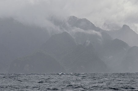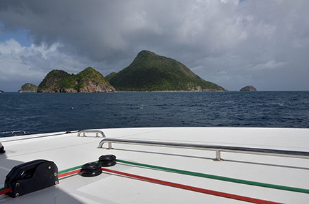 Dom (entre la Martinique et la Dominique) : "Départ de l'anse Couleuvre. Deux ris dans la grande voile, cap au 330. Nous sommes cueillis par des grains et laissons la Martinique sur notre tribord arrière. Houle par le travers, le vent forcit un peu avec des pointes à 30 noeuds. Splatch ! La vague scélérate arrive, douche gratuite dans le cokpit. Le temps se calme, lente remontée le long des côtes de la Dominique jusque St Joseph où nous allons mouiller pour la nuit."