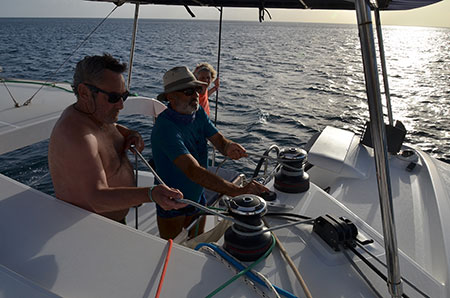 Madeleine (Des Saintes à Marie Galante) : "Dernière "grande" traversée de notre séjour. Il s'agit de quitter les Saintes pour rallier Marie Galante. Chacun est à son poste mais le vent n'est pas au rendez-vous. Les capitaines auront beau brasser l'air de leurs maoeuvres et tirer des bords, les 2/3 du parcours de 23 miles seront réalisés au moteur sur une mer souvent chahutée de vagues que nous prenons de face. Nous ancrons dans l'anse Canot, une carte postale ! Il est 20h, Orion est calé dans ma lucarne, dernier délice du jour."