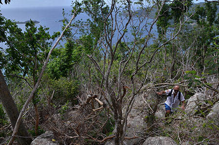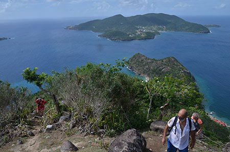 Marc (sommet du Morne Chameau) : "Le sentier s'avère bien pentu et la végétation bien dense (l'ouragan a fait des dégâts). Nous perdons les balises du sentier. Denis, alias Mike Horn, droit devant au milieu des plantes venimeuses, serpents, Bernard l'Hermite gigantesque dont l'énorme pince bleutée fend l'air en essayant de nous découper un morceau de mollet. Note du traducteur. Marc exagère, bien sûr ! Sûrement l'effet de l'abus de rhum de la veille. Soudain un déchirement étouffé. Merde ! ma belle chemise blanche. Je suis ému mais embêté tout de même. Je rejoins Mister Denis et Mister Mike. Mike voit ma chemise et se fout de moi dans un rire sarcastique. Il a les jambes en sang mais ça le fait rire ! Plus que dix mètres qu'il dit en reprenant de plus belle mais ça fait déjà cinq fois qu'il nous le dit ! Quoiqu'il en soit Mike retrouve la balise jaune et en quelques enjambées, nous atteignons enfin le sommet. Et là, c'est la récompense ! Une vue extraordinaire !"