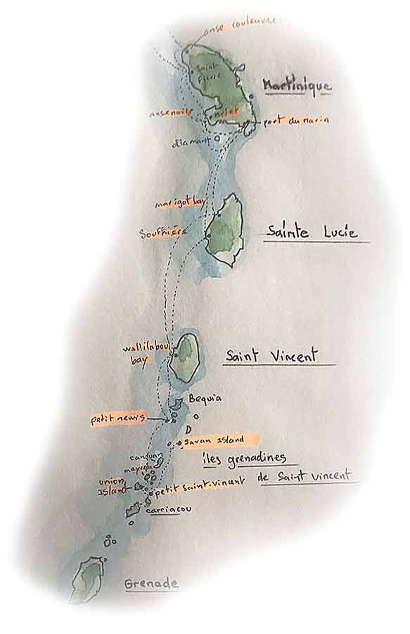 Sainte Lucie, Saint Vincent, les îles Grenadines, les Tobago Cays, Petit Newis, Savan Island, Union Island... Voilà des noms qui ne signifiaient rien pour moi ! Il faut dire que la géographie maritime, ce n'est pas mon fort. Bien sûr, j'ai lu "L'île mystérieuse", "Moby Dick", "L'île au trésor"... mais, tout en me faisant rêver, ce monde restait un univers que je ne pensais jamais connaître. Tellement inaccessible, que je n'y pensais même pas. Tellement inabordable, que je ne m'étais jamais dit "j'irai un jour". Et pourtant... Merci Marc, merci Marie !