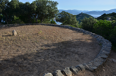 Balade de Campomoro à Campomoro. Notre chemin tortille entre les tamaris et les chênes verts. Le paysage est marqué de vieux enclos, de murs en pierre sèche et d'une belle aire de battage. Point cuminant du circuit, la Punta Mulina, 180 m d'altitude... quand même ! (Steph).