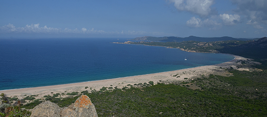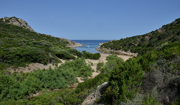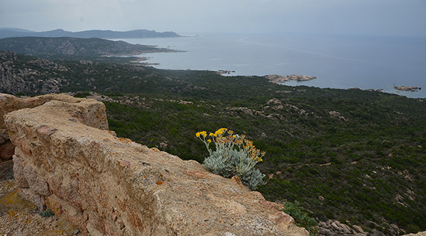On choisit de jeter l'ancre dans la Cala di Conca qui nous offre un havre de paix, à l'abri du vent. Marc me débarque sur la plage et m'y abandonne comme on le faisait, jadis, avec les mutins... En fait, la paresse s'est emparée du reste de l'équipage et je pars seul en vadrouille à terre. Grande boucle qui me mènera à la tour de Senetosa. Une échelle en fer un peu branlante permet d'accéder au sommet. Depuis le haut de la tour, on pourrait apercevoir la Sardaigne... mais pas aujourd'hui ! (Denis)