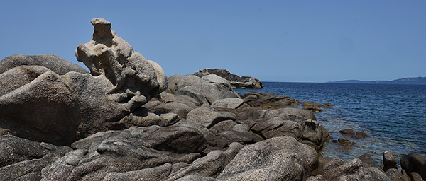 Cala d'Aguila, longue baie estuaire où tout le monde fait trempette. Retour en file indienne qui se disloque au gré des envies et intérêts de chacun. Marc, Marie et Madeleine fréquentent les dépôts de la mer dans l'espoir d'y trouver de beaux bois flottés. Denis lache ses chevaux de course en mode géocaching et moi je remplis mon "pot pourri" de senteurs mélangées. Les "tafonis" vont nous accompagner sur cette fin de parcours. Spectacle géologique garanti, avec un mélange de roches cristallines façonnées par l'érosion et qui prennent des allures de statues géantes. (Steph).