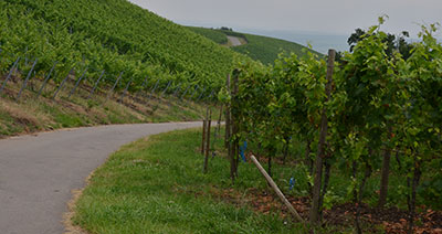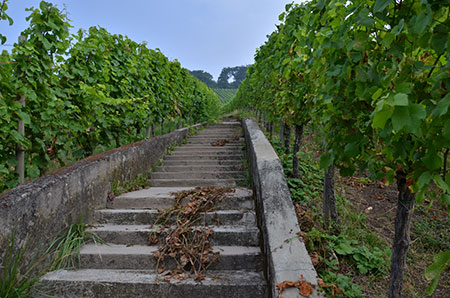 Paysage totalement différent, c'est le royaume de la vigne. Ah, ce vin blanc de Moselle... encore un clin d'œil à Jacques Brel et une pensée à toutes ces générations de vignerons qui s'y sont succédés depuis l'époque romaine. Le macadam est toujours là, par contre. Toutes les pistes d'exploitation en sont couvertes. Un véritable labyrinthe ! Heureusement que le balisage est au top !