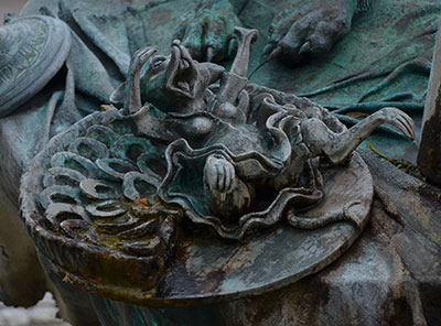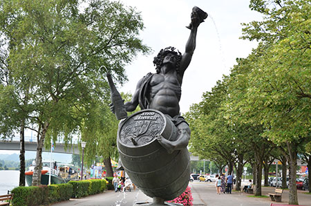 Et c'est reparti pour le macadam ! Descente sur Rémich, gros spot touristique au bord de la Moselle. Les bancs, à l'ombre et au bord de l'eau sont bien accueillants et j'ai l'air d'un extra terrestre avec mon gros sac, mes grosses godasses et mon Tshirt dégoulinant. Une terrasse, un café et je refais le plein, d'eau en vue du bivouac de ce soir. Les vedettes chargent leurs passagers pour une petite croisière sur la Moselle et la fontaine à Bacchus tourne sur elle même.