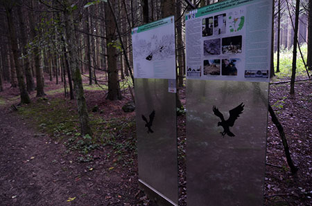 Longue traversée de Dudelange pour récupérer le GR sur une cache que je trouve facilement. Elle fait partie d'une série mais je ne m'éterniserai pas à toutes les faire. C'est chiant de poser son sac tous les 200m... Je passe devant une superbe cabane au toit végétalisé. Un immense feu achève de se consummer, témoin des agapes de la veille. Puis, c'est une suite de longues allées forestières parsemées de panneaux didactiques. Certains sont imprimés sur des surfaces vitrées... y a des sous au Luxembourg !