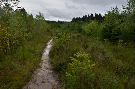 On quitte Stavelot par un tunnel piéton sous l'ancienne voie de chemin de fer. Il y coule un torrent qui arrive d'une cascade à l'autre bout. Traversée des Grandes Fagnes... landes et tourbières sur un sol bien gras où les pieds s'enfoncent bien profondément. Quand c'est pas l'eau du ciel, c'est l'eau de la terre ! ça rigole, ça glougloute, le sol est mouvant et toutes les ruses ne parviennent pas à éviter la trempette !