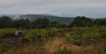 Je pose la tente en limite des Fagnes, sous une hêtraie. Le sol y est sec. Après une petite sieste, je pousse à pied jusqu'à l'observatoire. Belle vue... et , au loin, un terril monstrueux.