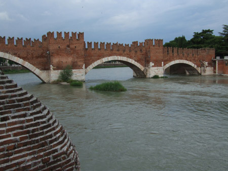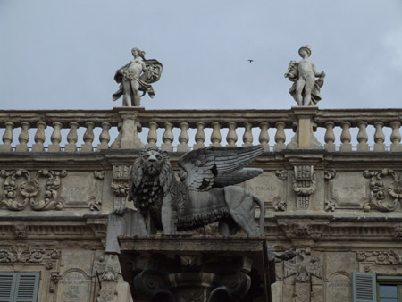 Réveil 5h50, il pleut ! J’ai vraiment bien fait d’avoir choisi cette option auberge, hier soir. Petite pluie, ciel plombé… qu’est ce que je suis bien dans mon lit ! Deux heures à attendre pour la "collazione". Je crois que je vais me rendormir. Petit dèj avec du pain un peu sec. Je laisse ma poubelle : j’ai fait le tri dans mon sac. Adieu gaz, sac en soie devenu un peu charpie, réserve de thé, dernier ragoton de saucisson, deux sachets de soupe, un paquet de vermicelle chinois, réserve d’eau et divers sachets plastique… allez au diable ! Ce soir, ce sera pizza, chianti et gelati !! 4 heures à attendre le bus dans le village qui est bien désert par rapport à hier soir. Le ciel est couvert, l’air est humide et moite. Heureusement qu’il n’y a pas grand-chose à faire, on doit suer sec s'il fallait marcher par un temps pareil ! J’ai eu raison d’arrêter. La vue plongeante sur la descente vers la plaine laisse entrevoir des lotissements un peu partout… Après un changement de bus à Stallavena, j'arrive à Vérone à 14h. Quartier de la gare et je cherche un hôtel pas trop loin. Un jour et demi de tourisme urbain, ça vous décoiffe un peu après 25 jours à faire le vieil ours solitaire !