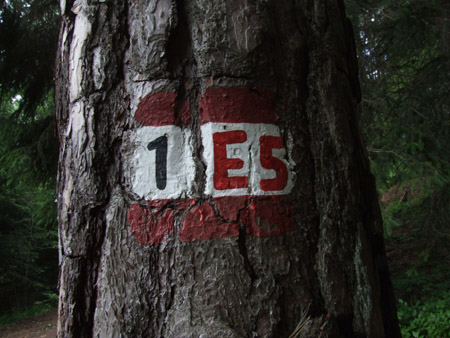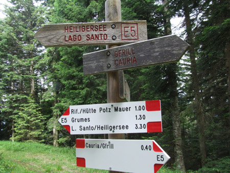 Arrivé à Gfrill et son Gasthaus près de l’église : café et deux parts de Strudel aux pommes. Le patron discute un peu et me dit que je suis le premier français qu’il voit passer sur le E5. Discuté avec un couple de randonneurs : lui, allemand et son amie du Kazakhstan. Partis d’Allemagne pour le E5 mais à cause du mauvais temps (celui que j’ai eu à Brégenz) ; ils sont descendus en train à Lévico et font le chemin en sens inverse. Ils marchent depuis deux jours… à votre santé ! Ils ont une tente (en secours) mais vont d’hébergement en hébergement. On se quitte sur une poignée de mains en se souhaitant bonne route. Reste du parcours dans cette éternelle forêt sapins/hêtres avec parfois d’étranges moments tout silence où on a l’impression que tout peut surgir : elfes, sorcières, ours…