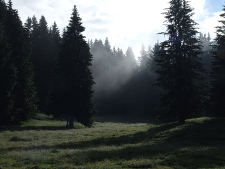 Dpt 7h30 fin 14h15 total 6h40 Asc 735m Dsc 900m Essuyé un bel orage hier soir. Mais très bonne nuit et réveil ce matin à 6h avec le mal de dos qui a disparu. Brouillard mais le ciel bleu n’est pas loin. Deux chamois sont passés sous la tente, aussi surpris que moi ! Rituel du café et rangement du camp. Le soleil fait quelques percées, des nuages vont et viennent. Le baromètre est stable. Que sera la journée ? Encore une fois, un cheminement agréable dans la forêt de sapin. Une dernière photo du monastère vu d’en haut.