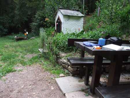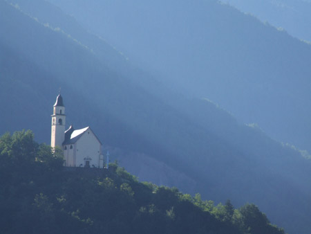 Dpt 6h40 fin 16h total 9h20 Asc 1230m Dsc 755m Lever 5h15 (c’est un peu tôt), j’ai descendu mon barda devant la capitela de St Antoine (en fait, ce n’est pas une chapelle) et je bois mon café avec la première clop de la journée. Je ne mange rien le matin : en fait, je n'ai pas grand chose à me proposer. Je viens de repenser au petit jeune à la gare d’Innsbrück qui m’a dit en anglais « what a beautiful bag ! » en admirant sans doute le volume de mon sac à dos… pourquoi je pense à lui ?? Je finis mon deuxième café, le sac est pratiquement rempli, plus que les chaussures à mettre. Je me suis lavé les mains au savon et débarbouillé la figure dans la fontaine de St Antoine. Je crois que je vais lui laisser une pièce dans la fente prévue à cet effet. Va donc savoir pourquoi ?