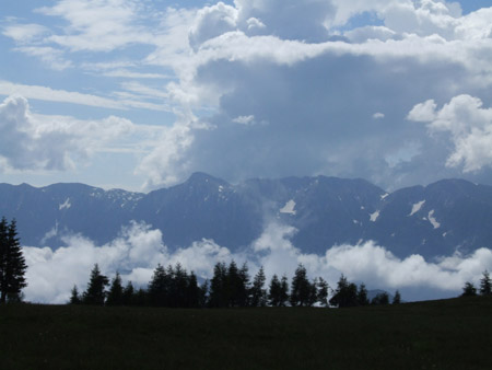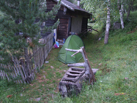 Arrivée au petit hameau de Quaras… le bout du monde. Une petite fontaine et un monsieur qui vient y laver son outil de jardinage. Il me demande si je suis « solo » et m’offre un verre de vin à boire. C’est con mais j’ai décliné son offre… Montée par un petit chemin agréable et descente sur la centrale où je me mange mon casse croute acheté à Faver (pas très frais mais il bourre bien). Montée très chiante sur le macadam de la grande route jusqu’au col de Redebus. Comme ils disent sur les commentaires de la carte : « un café est le bienvenu »… grand café, double dose de sucre et une petite bière. Pour la suite, je shunte l’itinéraire asphalte, je suis le E5… pour me perdre un peu… J’arrive dans un chalet où le proprio m’indique le chemin et me propose gentiment un café ou une orangeade. Je refuse là aussi, pour la deuxième fois de la journée ! J’ai toujours fait un peu le sauvage dans ce genre de situation. Descente sur l’église de St Magdalena où je dois trouver l’itinéraire de réchappe pour éviter les crêtes que je ne vois pas d’ailleurs : une partie est dans les nuages. Même météo depuis quatre jours : beaucoup de moments de soleil mais un ciel très chargé avec des nuages noirs qui s’accrochent aux montagnes. Ca tonne quelquefois, des averses éclatent au loin. Encore du macadam (j’ai été servi aujourd’hui) et ça grimpe sec dans le bois frais, heureusement. Sorti de la forêt, deux chalets en contrebas du sentier m’ont l’air bien tentant pour y poser la tente. Je trouve même un point d’eau pas trop loin. C’est le panard ! Basta pour aujourd’hui. 16h53, je sirote mon thé assis sur le perron du chalet, fermé bien sûr. Mais y aura bien un petit coin plat pour la tente, je n’ai pas encore prospecté tout le coin. Je vais étudier la carte pour demain : pas sûr de pouvoir être à Lévico… non, rien de moins sûr, surtout que ça se termine par une sacré descente. De toutes façons, rien ne presse, question bouffe, j’ai ce qu’il faut.