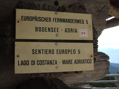 Dpt 6h15 fin 15h15 total 7h00 Asc 1120m Dsc 170m Lever 5h40. Le camping dort encore et je me fais un café en rangeant mon matos. Un dernier pipi au camping, le ciel est bleu et la forme est là. Belle montée dans un petit vallon sauvage (vallée de Pisciavacca... je connais que très peu l'italien mais là, le sens parait clair !) avec un bon point d’eau vers le milieu. Belle suée tout de même jusqu’à la Baïta del Cangi (plus de 2h de montée soutenue). Piste forestière jusqu’à l’auberge de Rovere. Je décide de quitter le E5 (aucune raison d’aller à Lusern. Ce détour n’est valable que si l’on cherche un gîte). J’espère attraper le bus à Rovere, sur la carte, un arrêt y est mentionné. Bingo ! Un bus va passer (1h ½ d’attente). Espresso et 1 bière au comptoir avec la patronne et un rital qui s’enfile un petit rouge. On discute un peu. Il me dit que l’automobile est une belle invention… je lui dit « qui va piano, va sano »… il est d’accord et il ajoute « qui va loin… ». Enfin, c’est ce que j’ai cru comprendre. Je tente vainement un peu de stop… mais y a peu de voitures. Le bus arrive à l’heure dite (12h34) et m’emmène jusque Carbonare. Un peu de mal à trouver le chemin… le E5 est indiqué plus que sommairement dans le secteur (déjà pour quitter Lévico, ce n’était pas évident).