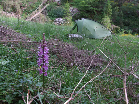 Eh bien, la reconnaissance a été bien utile : j’ai retrouvé effectivement le E5 au cimetière militaire de Forte Cherlé à environs 1km au-dessus mais de nombreux sapins déracinés vont me faire chier demain avec mon gros sac : faudra faire du hors piste… Rizzoto dégueulasse, ce soir ! Belle soirée dans un coin bien sauvage, dommage qu’il y ait des mouches. Entre la tente et le double toit, ça se bouscule, il y a du monde ! 20h20, je me fume une dernière clop et extinction des feux.