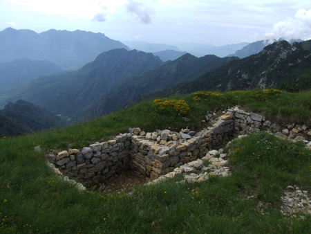 Dpt 8h20 fin 16h30 total 8h10 Asc 755m Dsc 1035m Super grasse mat… lever à 6h30 !! Mais bon, d’habitude à cette heure là, je marche déjà ! Petit dèj au soleil avec deux chamois qui rodent dans le coin. Je prends mon temps, il fait bon. Agréables, ces grimpettes du matin qu’on attaque lentement : le poids du sac n’en est pas encore à être chiant, les bâtons rythment la marche et on s’élève pas après pas, tout en rêvant. Et, quand on se retourne, on est surpris du chemin dé jà parcouru. Tranchées, casemates creusées dans la roche… ça a bataillé dur dans le coin. La Corne de Pasubio a l’air d’avoir été le théâtre d’âpres combats, comme on dit.