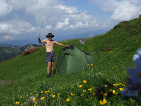 Un tout petit peu plus loin, c’est le miracle ! Quelques terrasses dominent la vallée, des rhodos, des orchidées, une vue d’enfer… j’avais raison d’y croire. Des ouvrages militaires, la vue sur la descente de Borcoletto et même un chamois qui ne me voit pas et que je regarde brouter, accroché à une vire. 19h52, j’ai fini de manger. Un petit café. Du brouillard monte de la vallée puis disparait. Un autre revient, le baromètre qui joue du yoyo. Maintenant, le ciel a l’air de se dégager… tout change très vite. Je crois que, si j’y arrive, je vais me payer une petite grasse mat demain matin ! 20h30, au lit.
