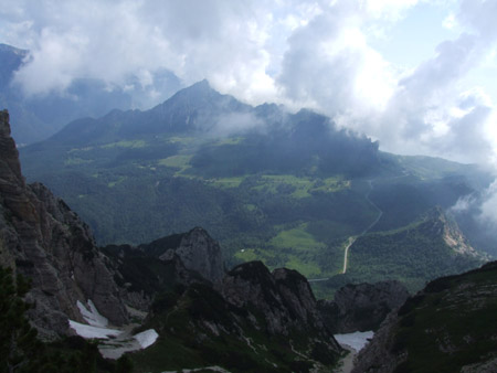 A l’Arco Romano (en contrebas d’une chapelle à la mémoire des combats du Monte Pasubio), je chope une route de guerre qui m’amène au refuge A. Papa (rien à voir avec le papa, c’est le nom d’un général…). Refuge Papa, accroché comme un nid d’aigle avec le brouillard qui monte de la vallée… c’est un refuge de randonneurs plus ou moins expérimentés qui viennent dans le massif du Pasubio. Je m’y arrête pour un café, ambiance refuge et une armée de mitrons prépare la bouffe. J’y laisse un petit mot dans le registre des gens de passage. Le début de la descente par la voie de guerre (Strada degli Eroi) me plait bien avec le brouillard, les névés, les tunnels, les plaques en mémoire de ceux qui sont morts en ouvrant cette route… ambiance.