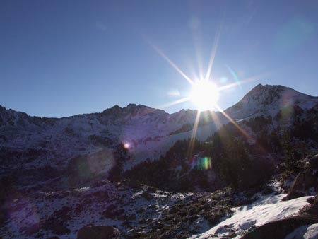 Deux gamelles en descendant : ça glisse, les rochers sont couverts de glace. J’ai plié un de mes bâtons et je me suis fait mal à un doigt. Les lacs sont superbes, l’air frais me titille les neurones, la lumière est éclatante, ça sent bon… je chope parfois des effluves qui me rappellent le Bégo et ces longs séjours à relever les gravures au bord des lacs, c'était il y a longtemps...