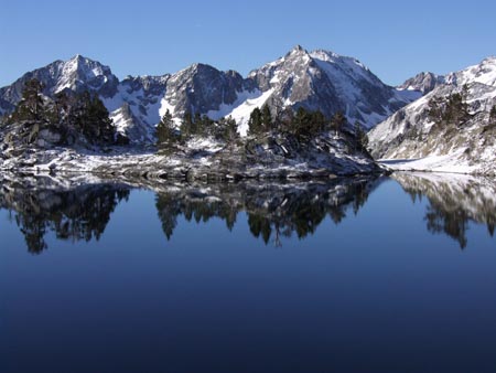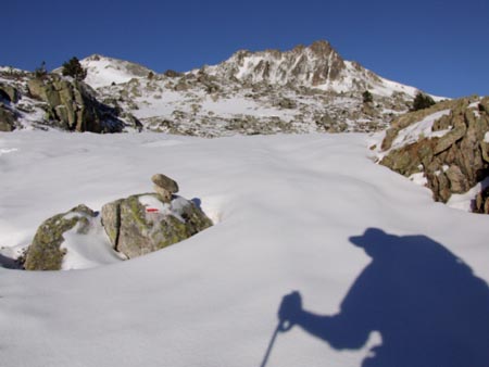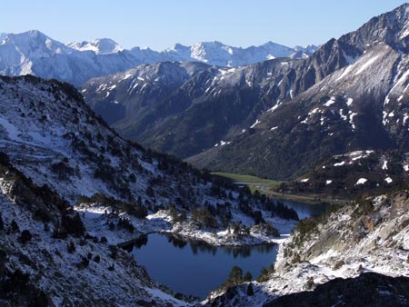 Belle montée au col de Madamète avec au sol une neige fraîche où je laisse une belle trace, courbe harmonieuse à flanc de montagne. Puis descente vers les lacs qu’on aperçoit en contrebas et toujours cette impression de se balader dans une carte postale.