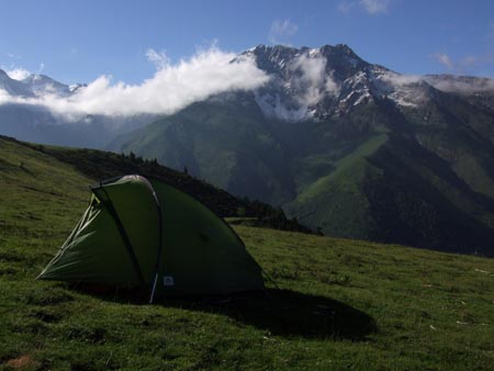 Enfin, c’était une bien belle journée et ce soir la vue est imprenable et les vautours sont à nouveau de sortie. Repas paisible, le vent est tombé, je suis allongé dans l’herbe, quelques vautours tournent au loin, la brume reste accrochée au massif en face de moi et le soleil joue à créer des éclairages magiques. Paisible !