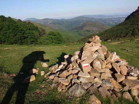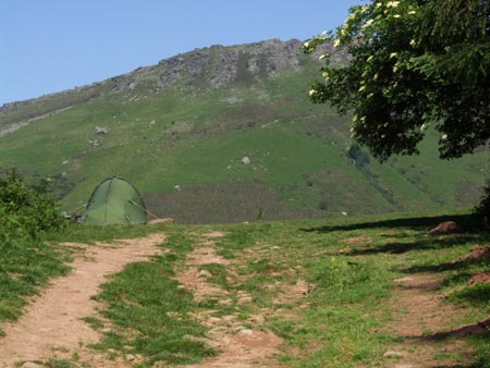 A partir du col d’Ibardin, je commence à en chier un peu… pour finalement planter la tente au col du Grand Descarga. Beau coin dominé par la Rhune et avec un bon point d’eau. Un peu mal au dos et aux genoux… un petit cachet. Après avoir mangé, ça va mieux (semoule avec un bouillon cube : c’est pas mauvais et ça passe bien).