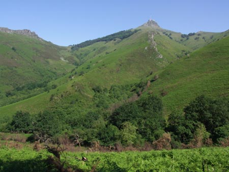 Arrivé la veille en train à Hendaye. Nuit à l’hôtel Bellevue, tout près du casino : point de départ officiel du GR10. Moules, frites au casino, face à l’océan et à une armée de véliplanchistes en attente de la vague… drôle de sport ! Pas trop top au niveau moral. J’espère que les premiers pas de demain vont me reconnecter les neurones. Pas très bien dormi et pris le petit dèj à l’hôtel à 7h. Traversée de Hendaye, l’œil aux aguets des célèbres marques rouges et blanches car jusque Biriatou le balisage n’est pas super. Serait-ce à cause de la future LGV dont les gens du coin n’ont pas l’air de vouloir et qui risque de bouleverser un peu l'itinéraire du GR10 dans ce coin là … Rapidement, on traverse des vallées profondes et luxuriantes. A la première grimpette, je croise deux vieux dont l’un me dit : "elle est raide, hein ? Y en aura d’autres de pires !" Pauvre con ! Il avait le look du vieux chasseur arrogant… et, dans le coin, les cartouches jonchent le sol… vaut mieux pas trop randonner par ici quand les palombes sont de passage ! Je me mets en short très rapidement : c’est le cagnard et je consomme un max d’eau. Une succession de petits cols sympas avec mes premiers F’murr, mes premiers vautours, mes premiers chevaux de la préhistoire (les Pottöks) et mes premières Ventas au col d’Ibardin : quel bordel ! Des bus entiers de gens qui font la queue pour acheter je ne sais quoi… alcool, vin, tabac, tissu et j’en passe. Je m’y arrête pour une petite bière : 20cl de San Miguel... on est loin de la pinte anglaise !