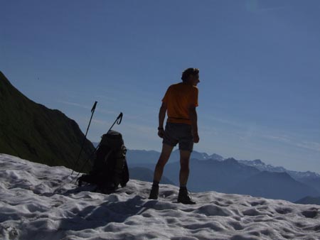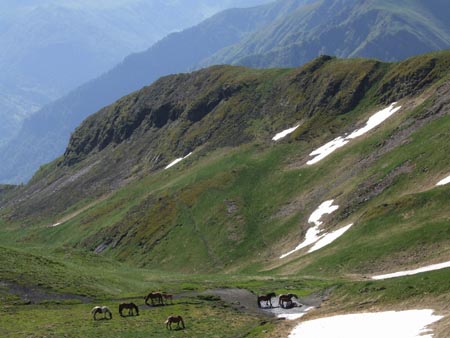 Je retrouve le GR et commence la montée en balcon et lacets au-dessus du lac d’Oo… rude montée mais cette sensation d’être plein ciel est agréable. Et à nouveau ce coup de soleil bénéfique juste en haut de la Hourquette des Hounts Secs d’où je vois encore, à l’horizon, le col de Portet et, plus loin, peut-être Madamète… Montagne russe ensuite jusqu’au Col de la Coume de Bourg et son névé sur la face Est. Photo, casse croute et c’est parti pour 1620m de descente jusque Luchon ! Je me faufile entre deux chevaux pour boire une gorgée à la source juste sous le col et ce sera la dernière jusqu’en bas… j’ai horreur d’avoir soif !